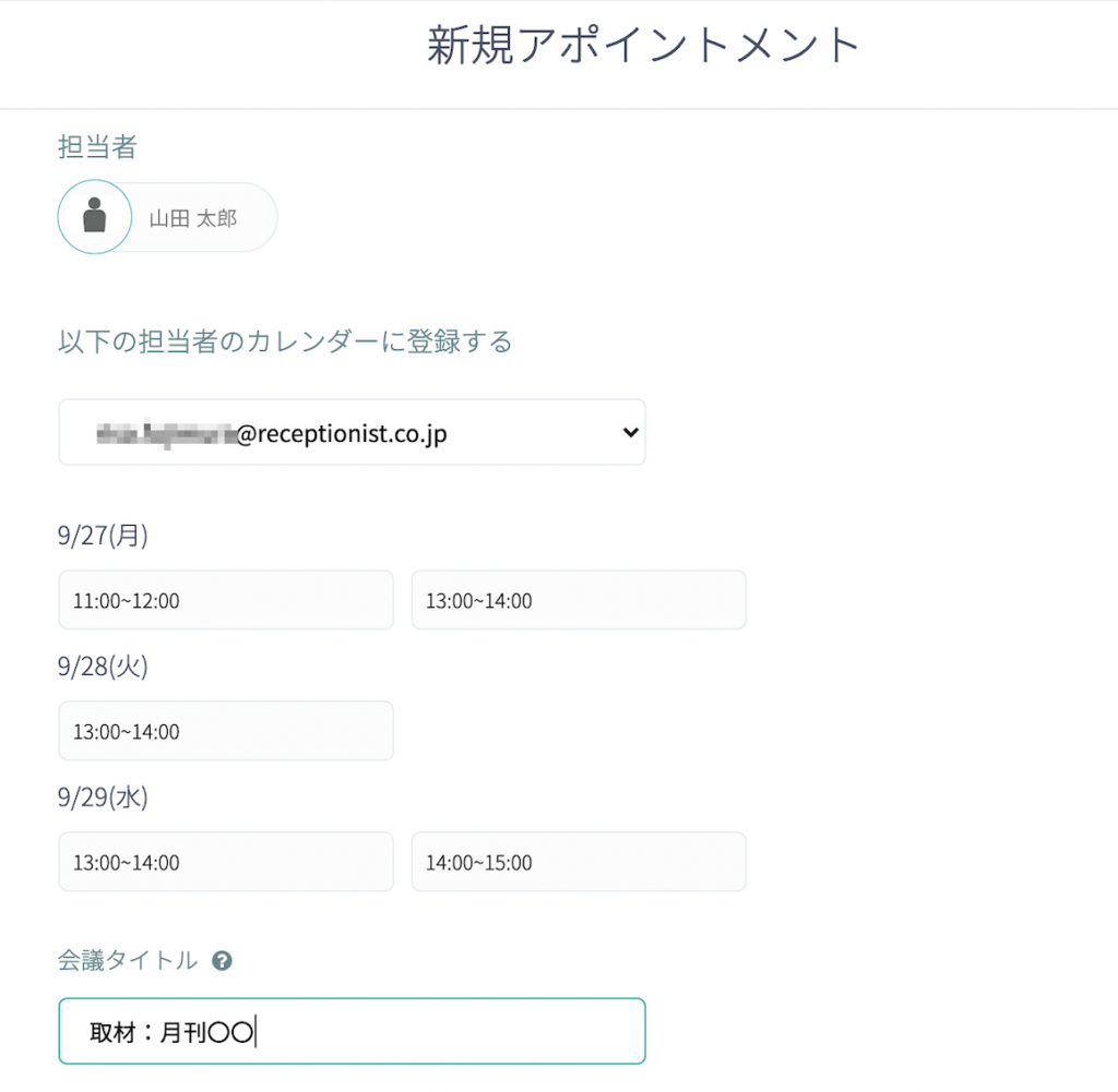 日程調整でたびたび起こるのが、日程調整をしている間にどんどん社員の予定が埋まっていってしまうこと。 当初は空いていたのに、いざ取材日が決めるとすでに別の予定が…なんてこともあるのではないでしょうか? とはいえ、確実に確保することを優先して「取材入りそうなので、確定するまではこの日とこの日を丸1日空けておいてください!」とも言いにくい…。社長や役員ならなおさらですよね。 調整アポは、カレンダーと自動連携するため、すでに予定がある時間は新たに予約できないようになっています。これでダブルブッキングの心配はありません。